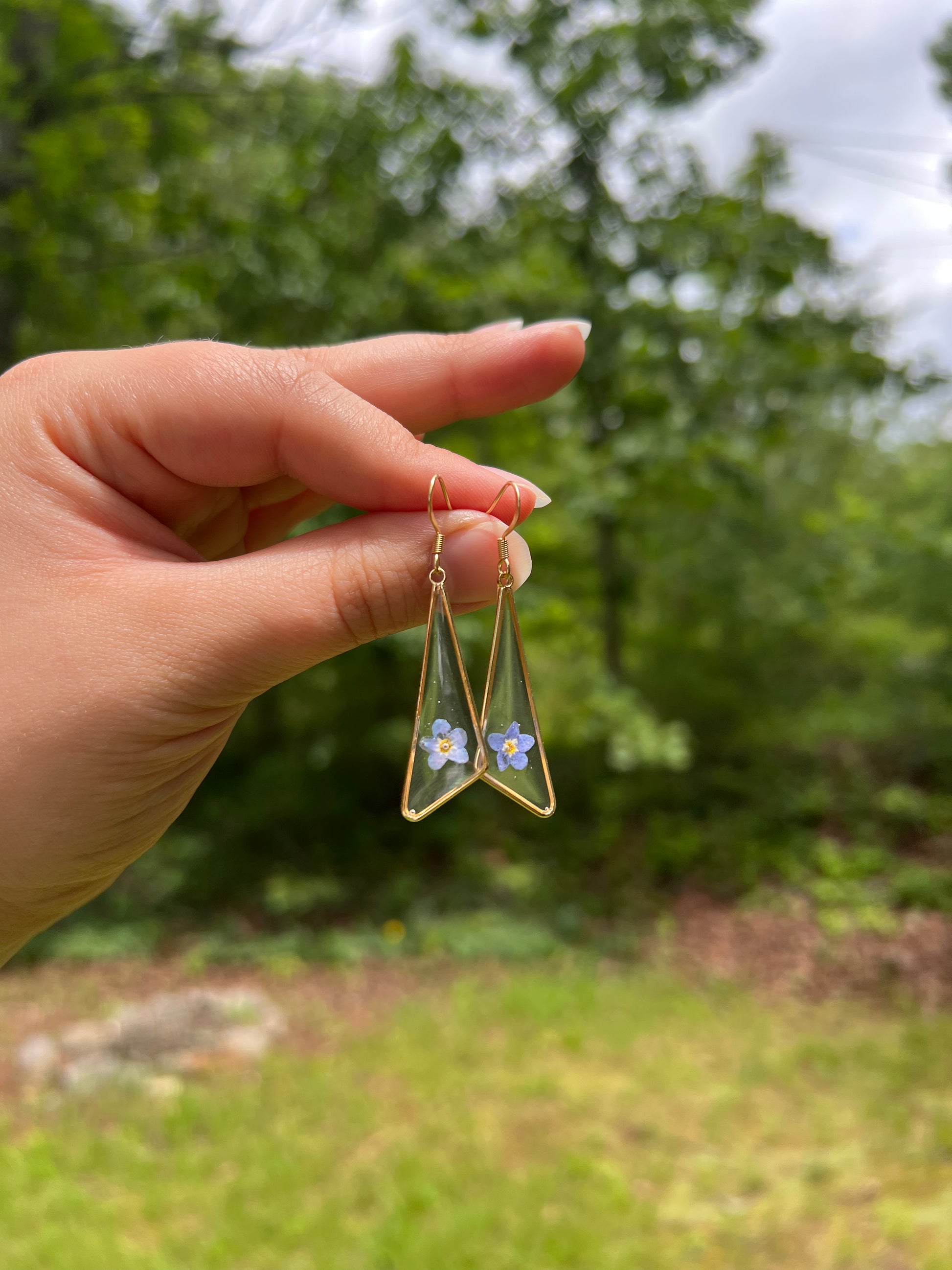 These forget me not earrings are lovingly handcrafted with real dried flowers encased in crystal-clear resin.