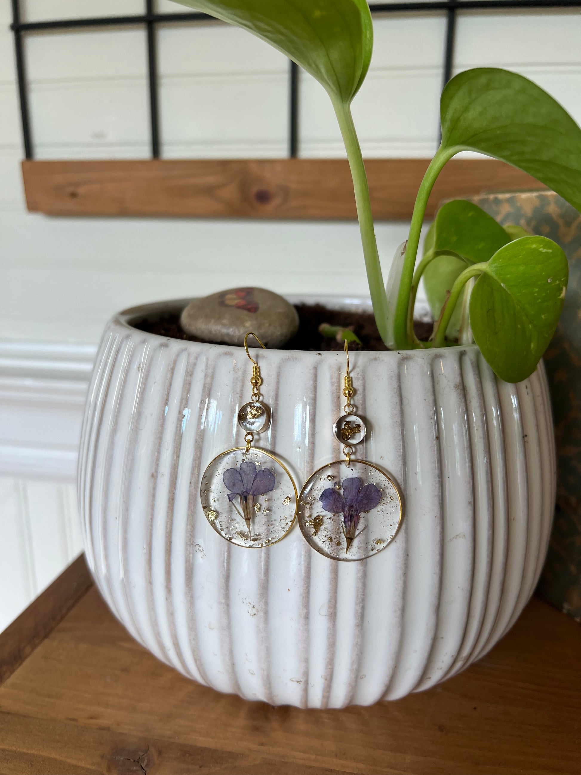 Handcrafted by Lavender Lynn Design. Featuring real flowers preserved in resin with gold flake. Due to natural variances in flowers, no two are exactly alike, although I try my best to match them to cover images.