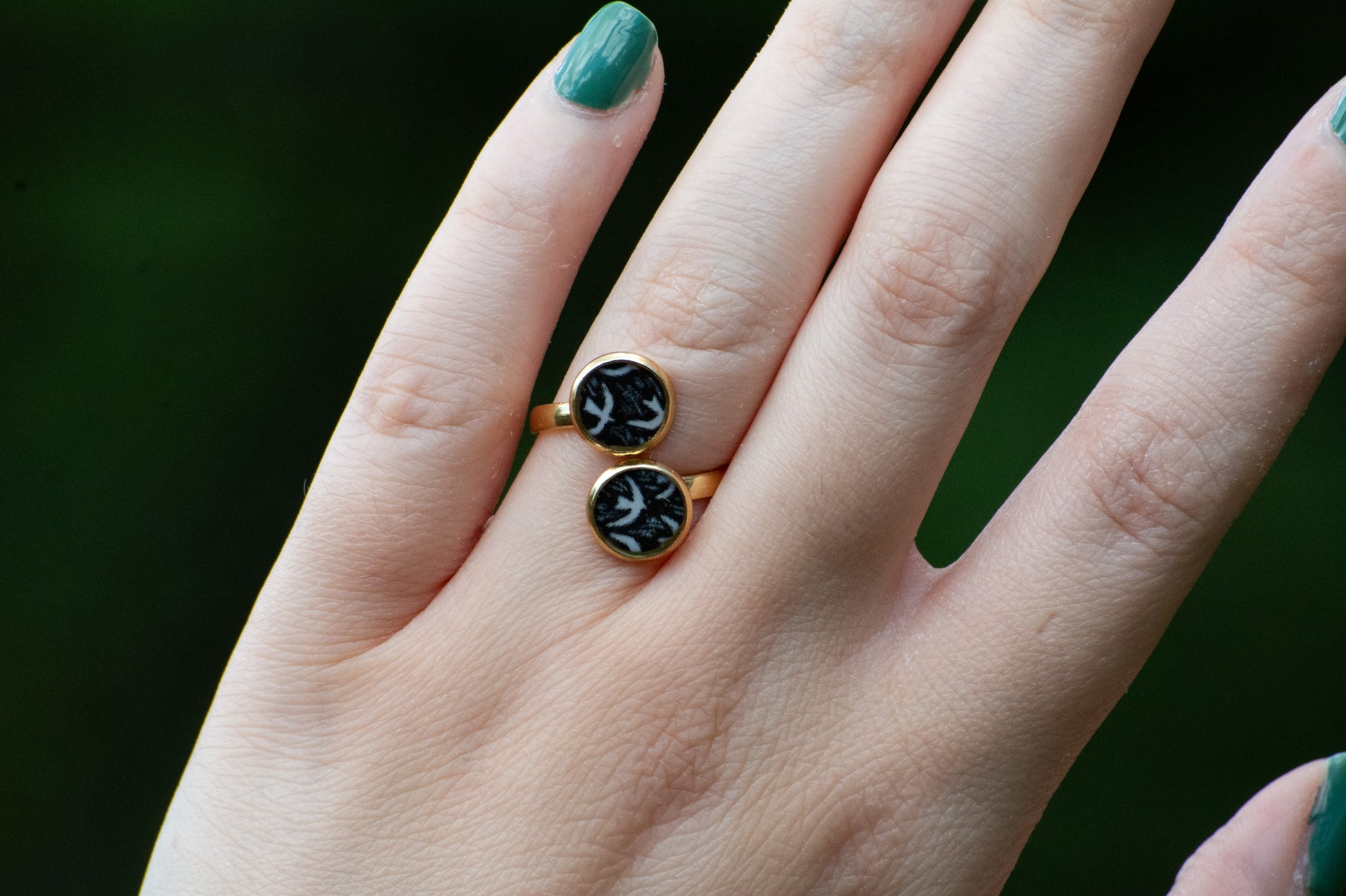Set in a gold-plated stainless steel band with twin 10mm bezels, this ring carries both warmth and contrast; nature’s movement against polished gold. The band is gently adjustable, making it a versatile fit across a range of sizes.