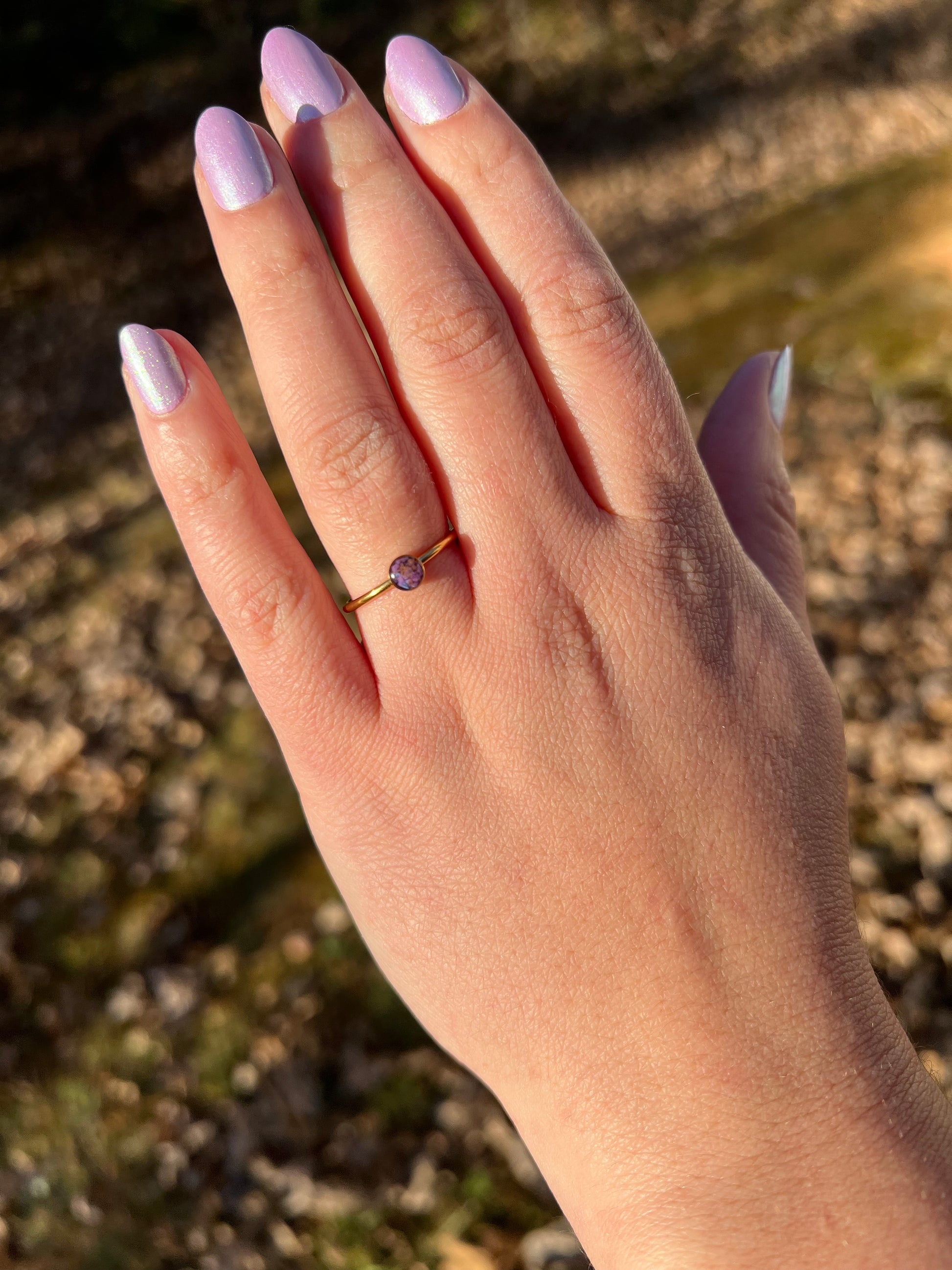 Delicate, vibrant, and full of character. This handmade ring features crushed purple copper turquoise set in resin, framed in a petite round gold-plated stainless steel bezel. Fully adjustable and skin-safe, it’s a lightweight, charming piece perfect for stacking or adding a subtle pop of color to your everyday look.