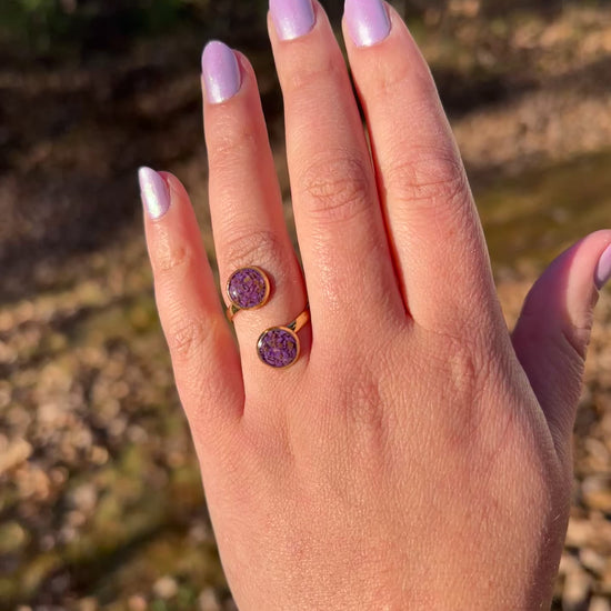 A burst of color and character for your everyday style. This handmade ring features purple copper turquoise set in resin, framed in durable, hypoallergenic stainless steel. Fully adjustable, lightweight, and comfortable for sensitive skin, it’s a unique piece that stands out whether worn solo or stacked.