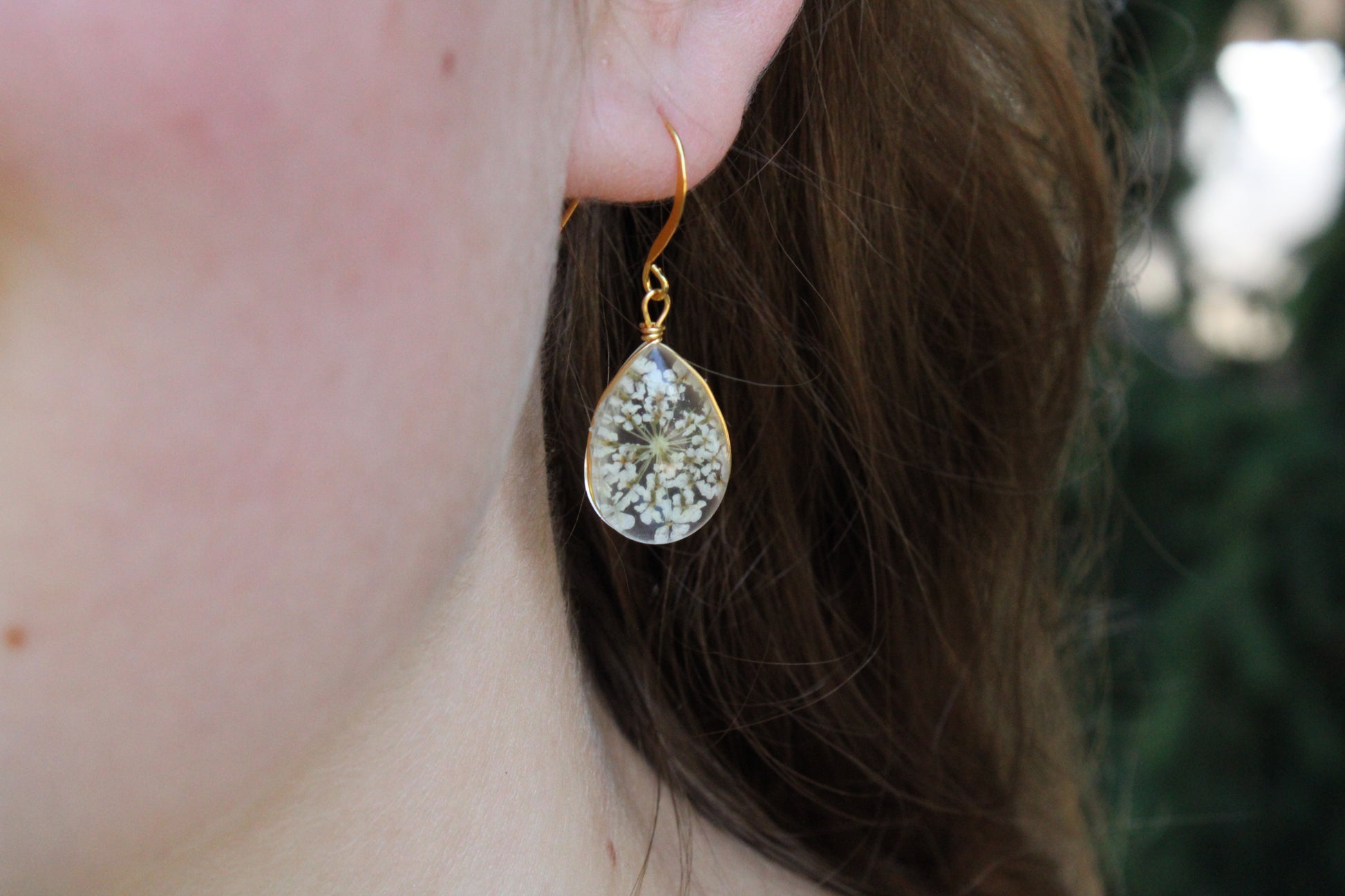Delicate and nature-inspired, these small free-form Queen Anne’s Lace earrings are handcrafted with real dried flowers encased in crystal-clear resin, framed by graceful but subtle wirework, so as to not distract from the florals. Each pair is a unique tribute to the natural elegance of wildflowers. Finished with gold-plated sterling silver earring hooks, they offer both charm and comfort.