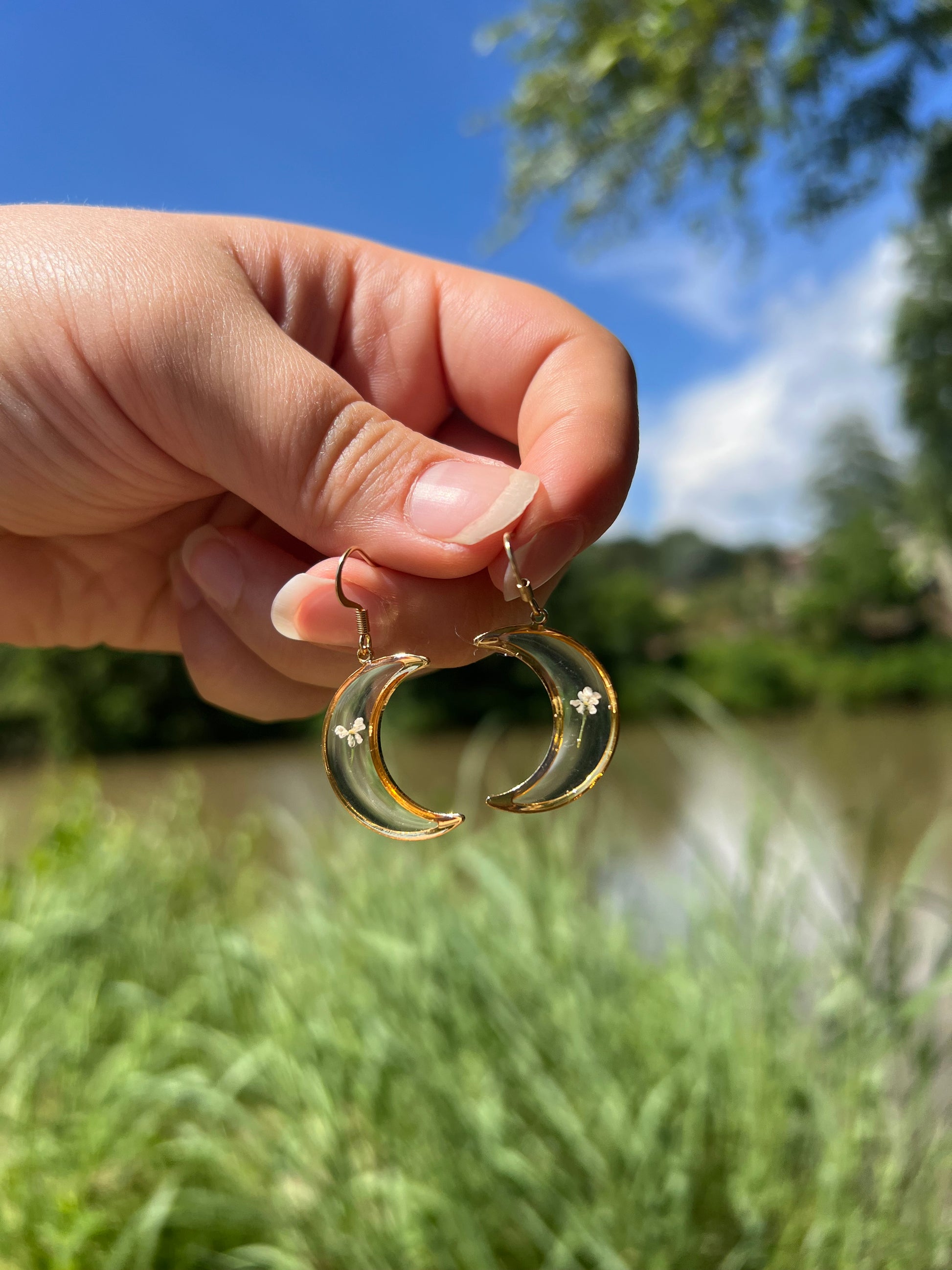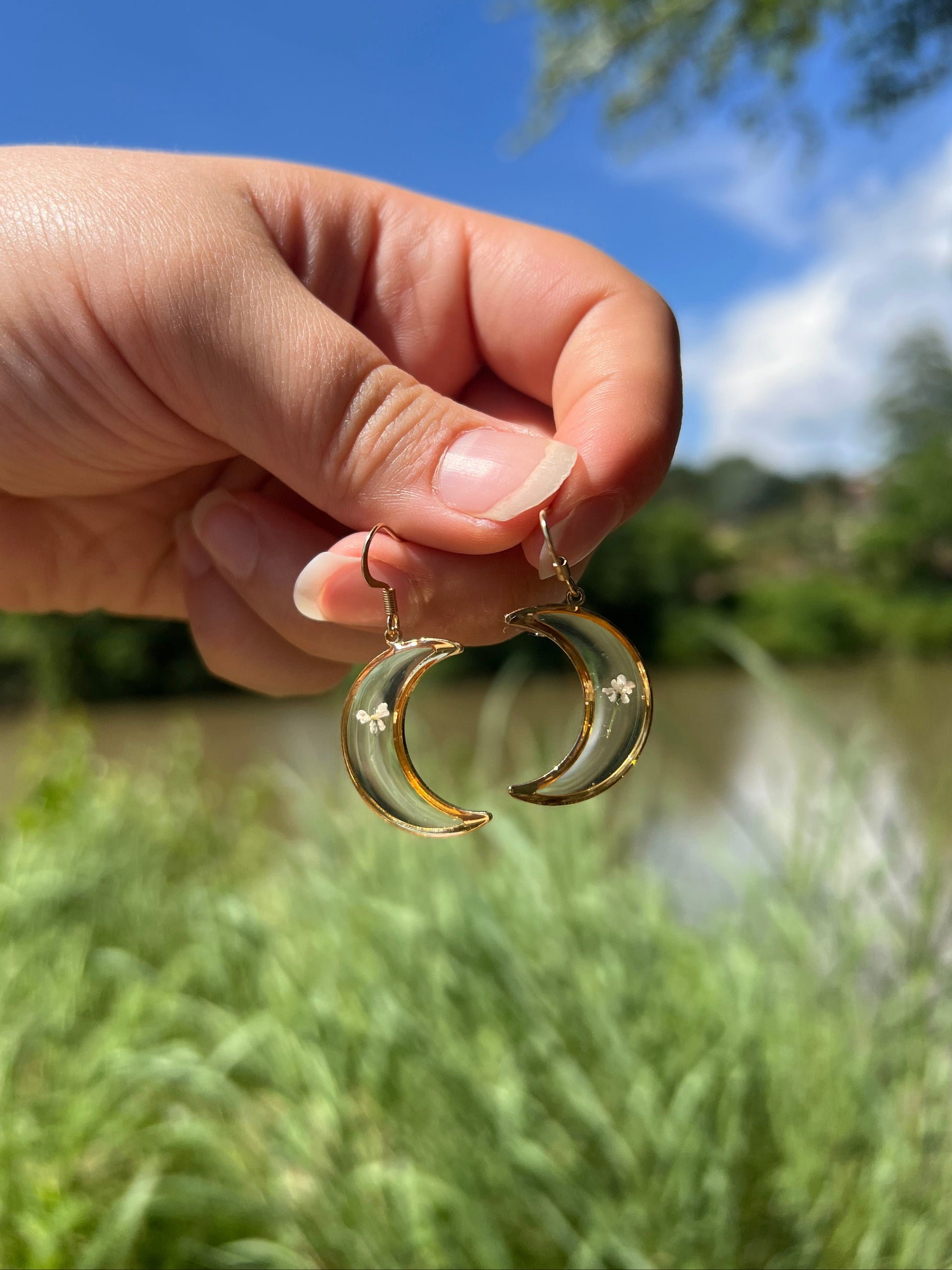 Delicate, dreamy, and full of natural elegance—our Queen Anne’s Lace Moon Earrings capture the ethereal beauty of wild blooms under moonlight. Each crescent moon is carefully filled with a real Queen Anne’s Lace flower, preserved in resin. Lightweight and gold-plated, these earrings blend celestial charm with botanical romance for a truly enchanting look.