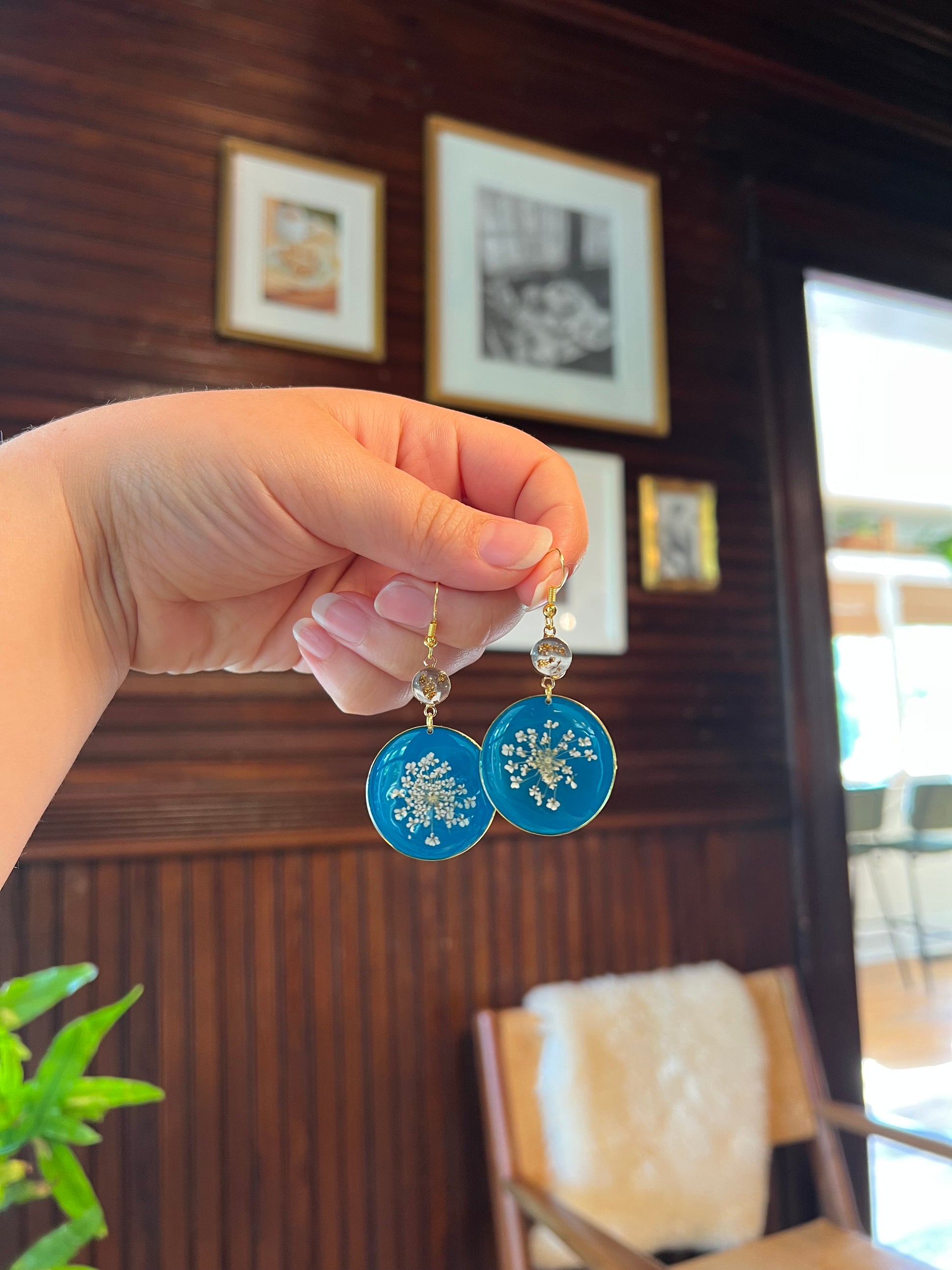 Delicate and enchanting, these earrings feature real Queen Anne’s Lace flowers set against a teal-tinted, color-shifting background that shimmers beautifully in the light. A touch of gold flake adds an elegant dangle for extra movement and sparkle.
