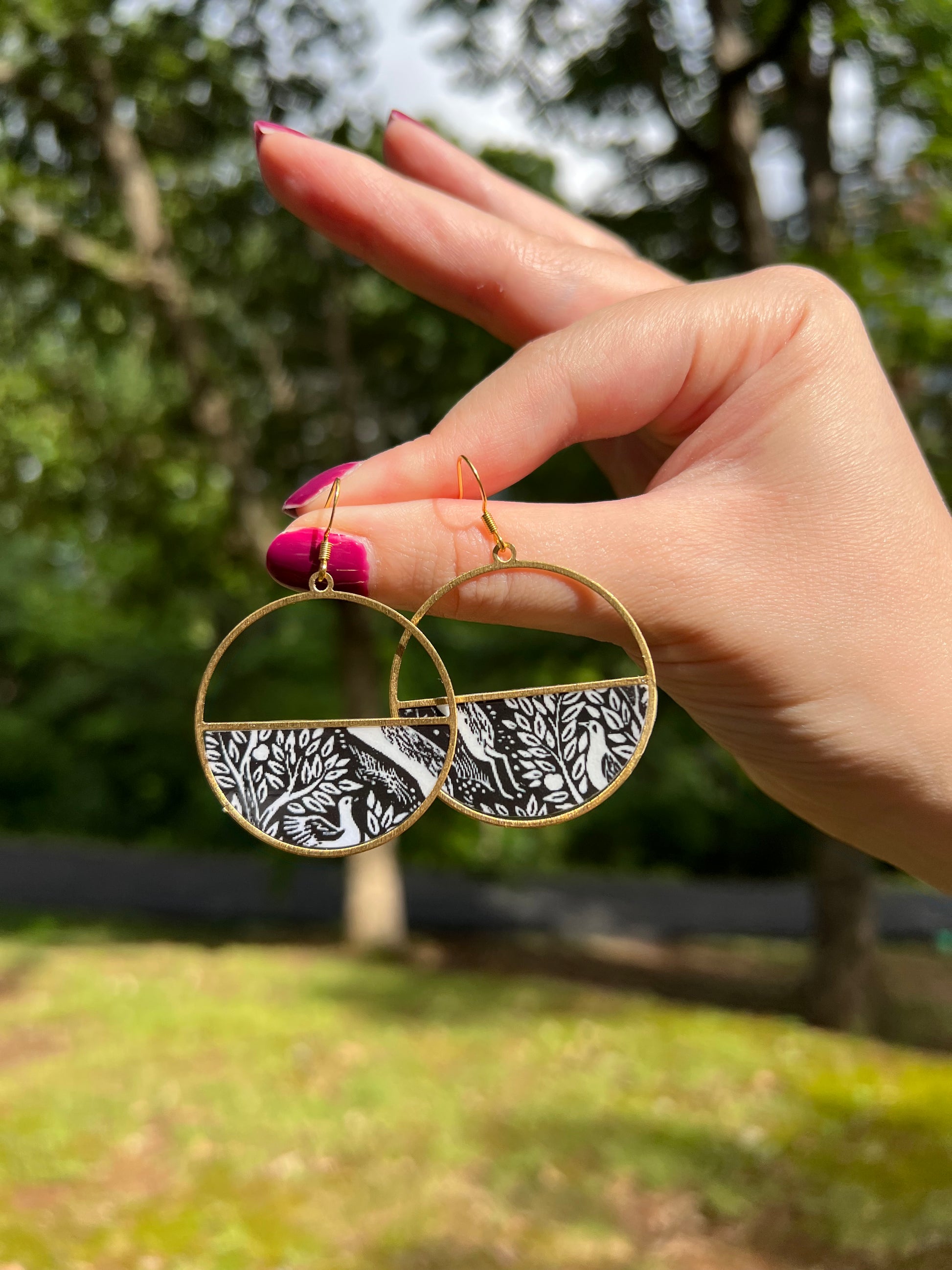 A quiet moment in motion — the Twin Doves earrings feature two halves of a brass circle, each capturing a fragment of Diana Catchpole’s Fantastical Animal Fest. Together, they reveal a serene scene: two doves facing one another, with a leaping deer, frozen mid-flight beneath a star-kissed sky.