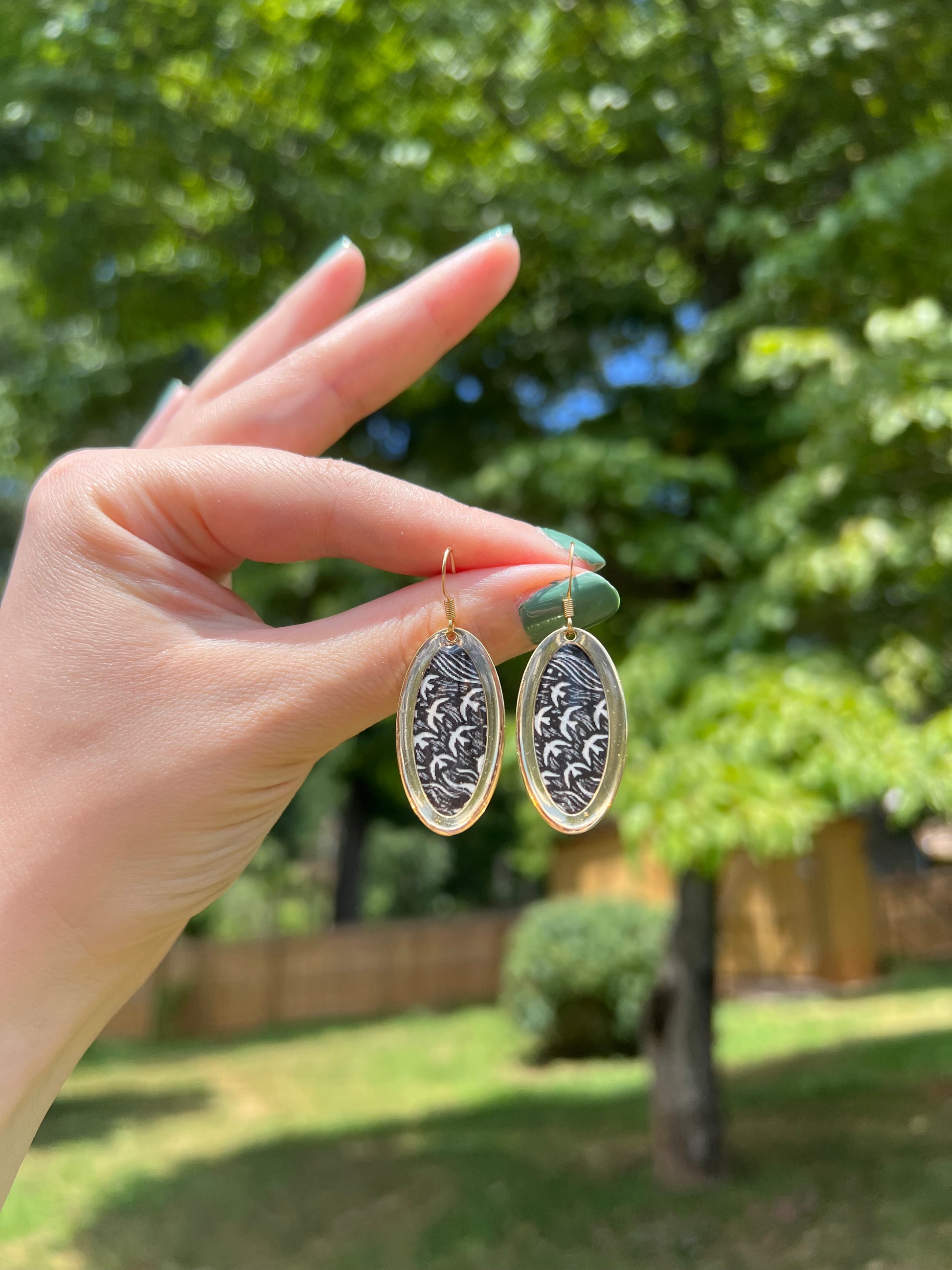 A gentle flutter frozen in time. Twilight Aviary features a cluster of birds mid-flight, captured from Diana Catchpole’s Fantastical Animal Fest and preserved in resin like a soft breeze held still. Each piece is set in a brass oval bezel and finished with gold-plated stainless steel hooks.